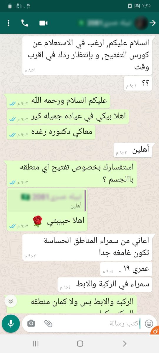 بدأت خلود في التحدث مع طبيبة الجلدية و التجميل لعياده جميلة كير (نحن) عبر الواتساب عندما رأت مقالة مشابهة لهذه المقالة تتحدث عن كيفية التخلص من الاسمرار بشكل آمن جداً و في أسرع وقت.