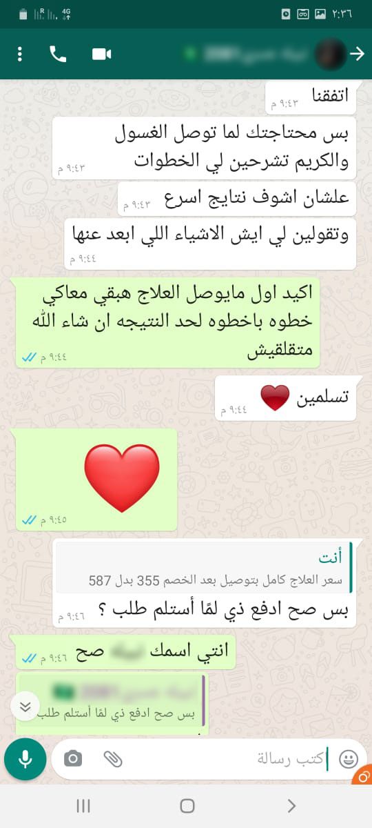 بدأت خلود في التحدث مع طبيبة الجلدية و التجميل لعياده جميلة كير (نحن) عبر الواتساب عندما رأت مقالة مشابهة لهذه المقالة تتحدث عن كيفية التخلص من الاسمرار بشكل آمن جداً و في أسرع وقت.
