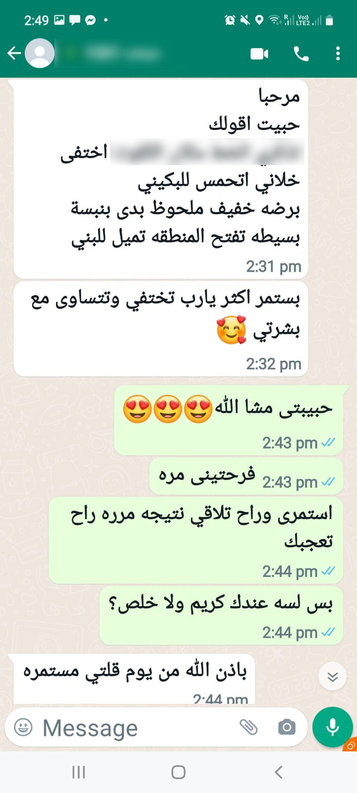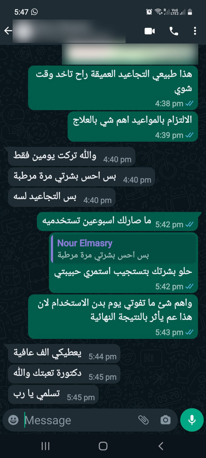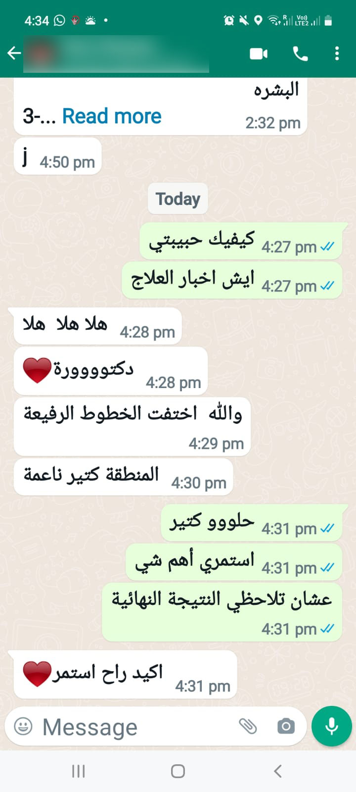 - طبيبة متخصصة تتابع معاكي طوال فترة العلاج و توجهك للطريقة الصحيحة لين توصلين لنتائج ترضيكي.