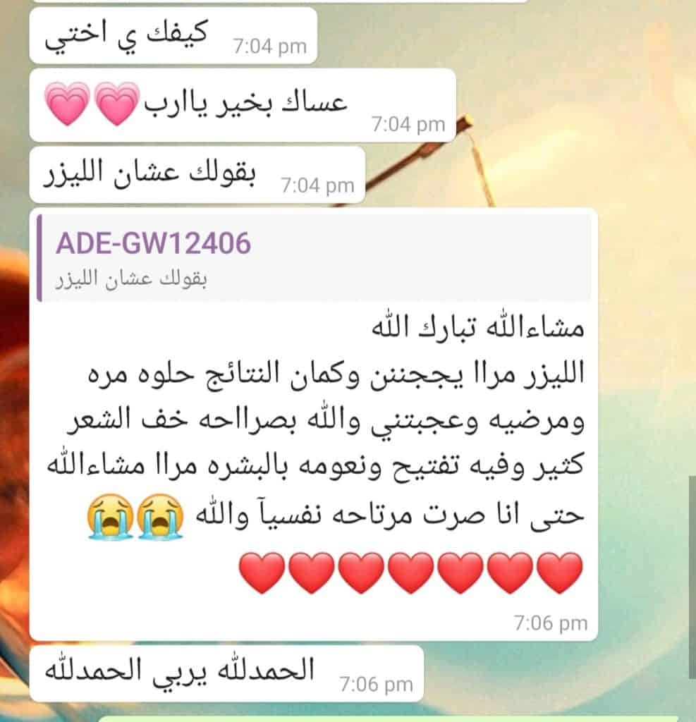 خبيرة الليزر اللي كانت تتابع مع هذي الجميلة تقول إنها فرحت من قلبها للبنت لأنها كانت تعاني من الشعر السميك واللي كان يسبب اسمرار ببعض المناطق في جسمها، وكانت منجد محرجة من زوجها.